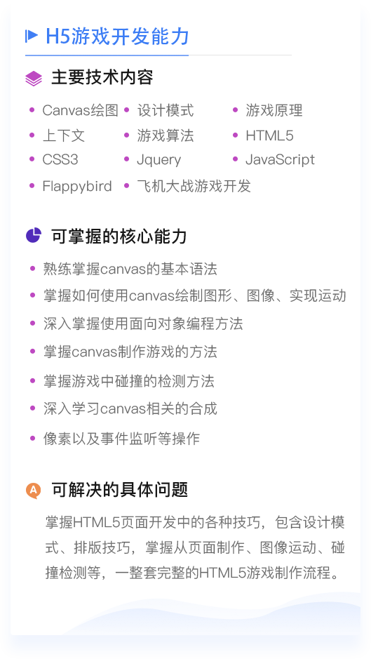 熟练掌握canvas的基本语法、掌握如何使用canvas绘制图形、图像、实现运动、深入掌握使用面向对象编程方法、掌握canvas制作游戏的方法、掌握游戏中碰撞的检测方法、深入学习canvas相关的合成、像素以及事件监听等操作